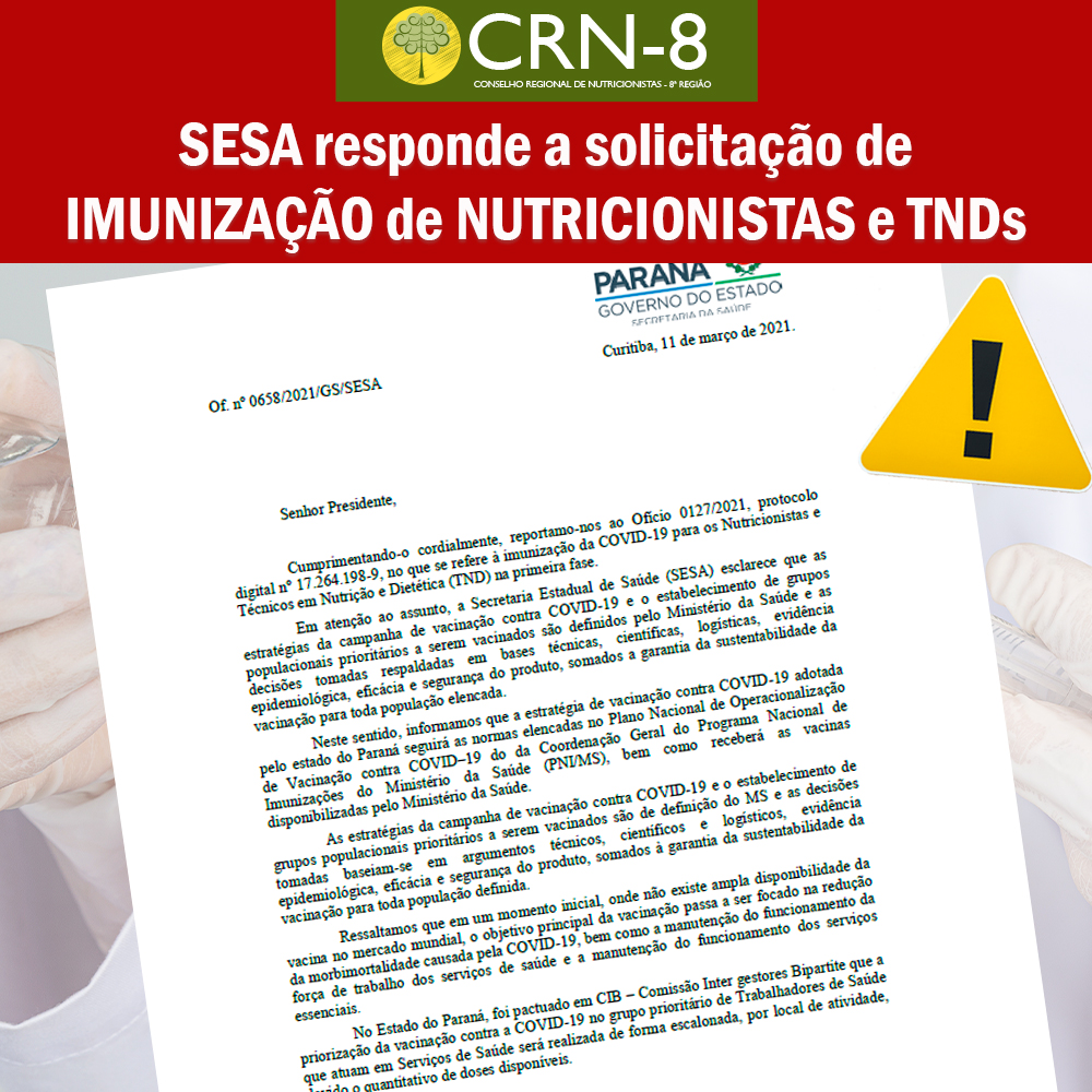 A Secretaria de Estado da Saúde (SESA) respondeu ao Ofício nº 127/2021/CRN8-SD, enviado no dia 18 de janeiro, solicitando a imunização da Covid-19 para os Nutricionistas e Técnicos em Nutrição e Dietética (TND) na Primeira Fase. No ofício o CRN-8 justifica que estes profissionais são da área da saúde, designados pela Lei nº 8.234/1991 e Resolução CFN nº 604/2018, em todas as suas áreas de atuação, conforme as Resoluções CFN nº 600/2018 e 605/2018, respectivamente.